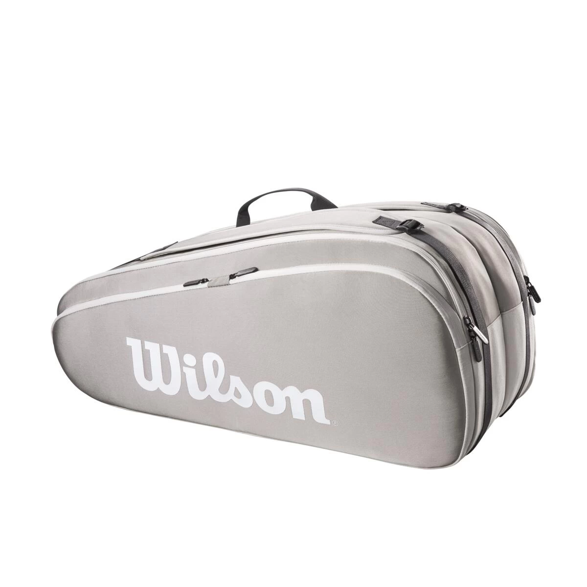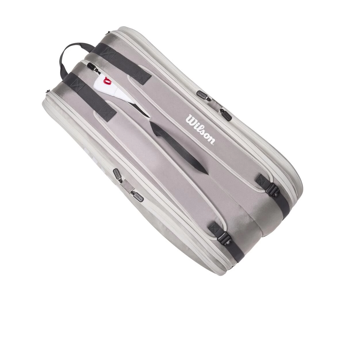- die Tour 12er-Tasche von Wilson in der modischen Farbe Stone hat zwei separate Reißverschlussfächer für Ausrüstung (bis zu 12 Schläger) und Bekleidung